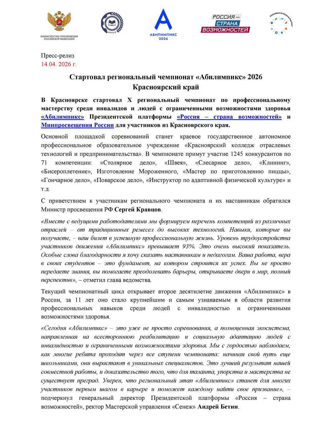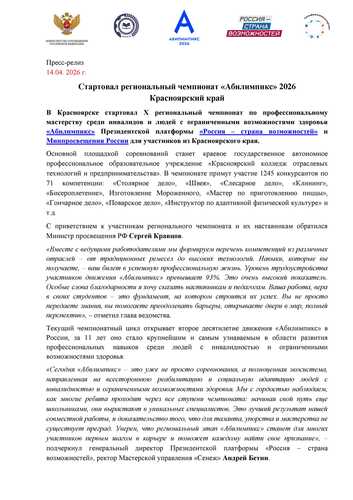 2 апреля 2026 г в г. Красноярске на площадке кулинарного пространства FORRESTO, в рамках «Сибирского Форума Гостеприимства – 2026» состоялся молодежный чемпионат кондитеров «Красноярочка», объединивший студентов системы среднего и высшего профессионального образования. читать далее