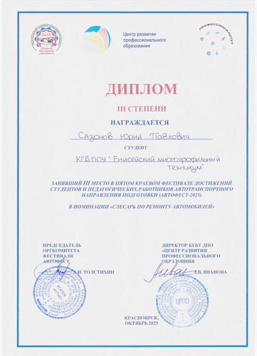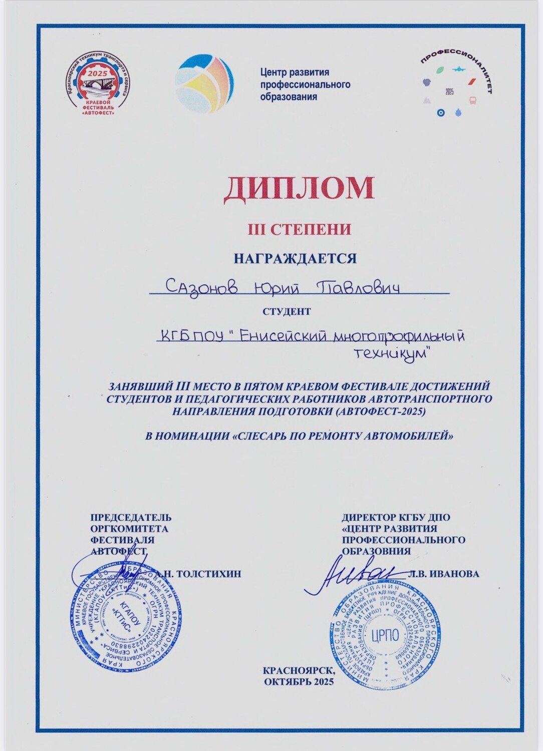 🎗️ Сазонов Юрий занял 🥉место в номинации «Слесарь по ремонту автомобилей»;