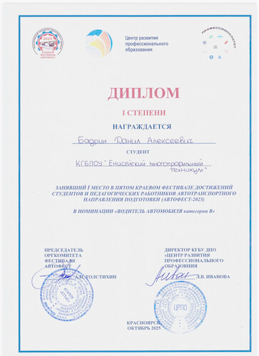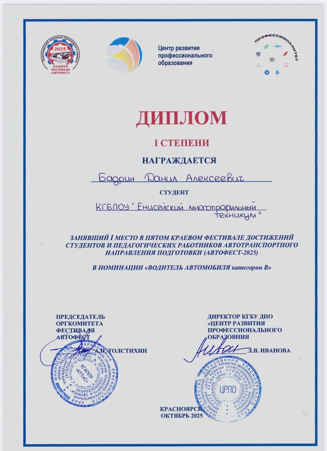🎗️Бадрин Данил занял 🥇 место в номинации «Водитель автомобиля категории В»;