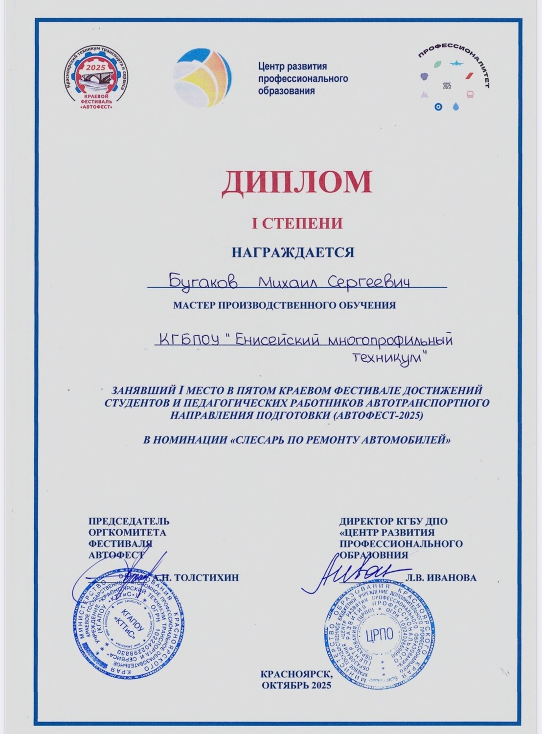 🎗️Бугаков М.С. занял 🥇место в номинации «Слесарь по ремонту автомобилей».