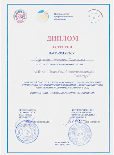 22 октября в г. Красноярске на базе КГАПОК «Красноярский техникум транспорта и сервиса» при организационной поддержке КГБУ ДПО «Центр развития профессионального образования» прошел V краевой фестиваль достижений студентов и мастеров производственного обучения по профессиям и специальностям автотранспортного профиля - Автофест-2025.