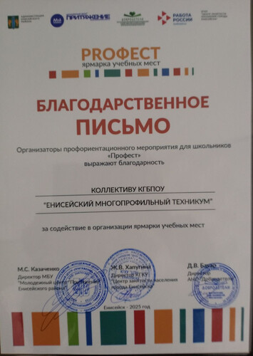 Реквизиты КГБ ПОУ "Енисейский многопрофильный техникум" Адрес:663180 Красноярский край, г. Енисейск, ул. Худзинского,73 тел: 8(39195)2-55-79 Директор Каличкина Ирина Владимировна Написать письмо