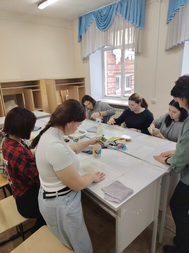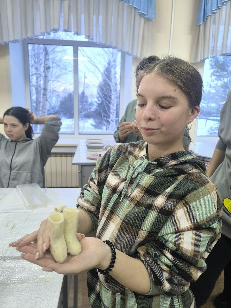 🧶Первый мастер-класс назывался «Шерстяной мир», где обучающиеся работали с войлоком, войлок – один из древнейших материалов, используемых человеком, с богатой культурной и практической значимостью в народных традициях России и других стран. Ребятам рассказали о разнообразии техник войлоковаляния и на практике уже осваивали техники мокрого валяния и создание собственных сувенирных мини-валенок. Мини-валенки станут не только сувениром, но и символом личного прикосновения к старинному ремеслу.