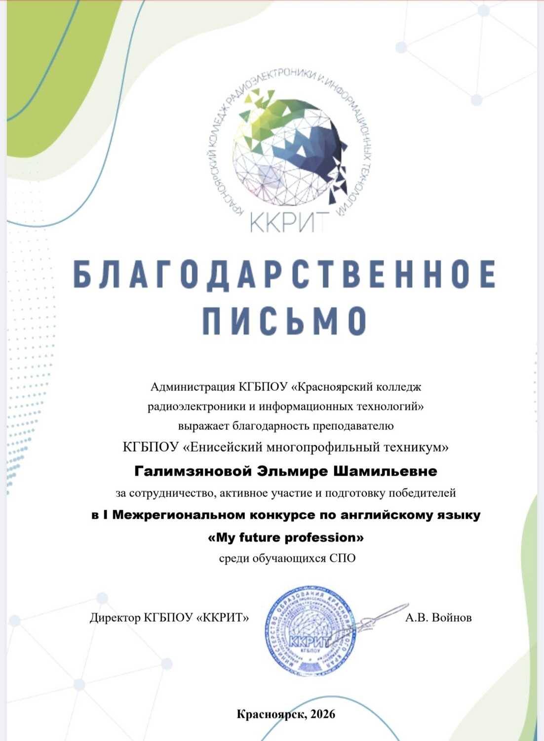 Реквизиты КГБ ПОУ "Енисейский многопрофильный техникум" Адрес:663180 Красноярский край, г. Енисейск, ул. Худзинского,73 тел: 8(39195)2-55-79 Директор Каличкина Ирина Владимировна Написать письмо