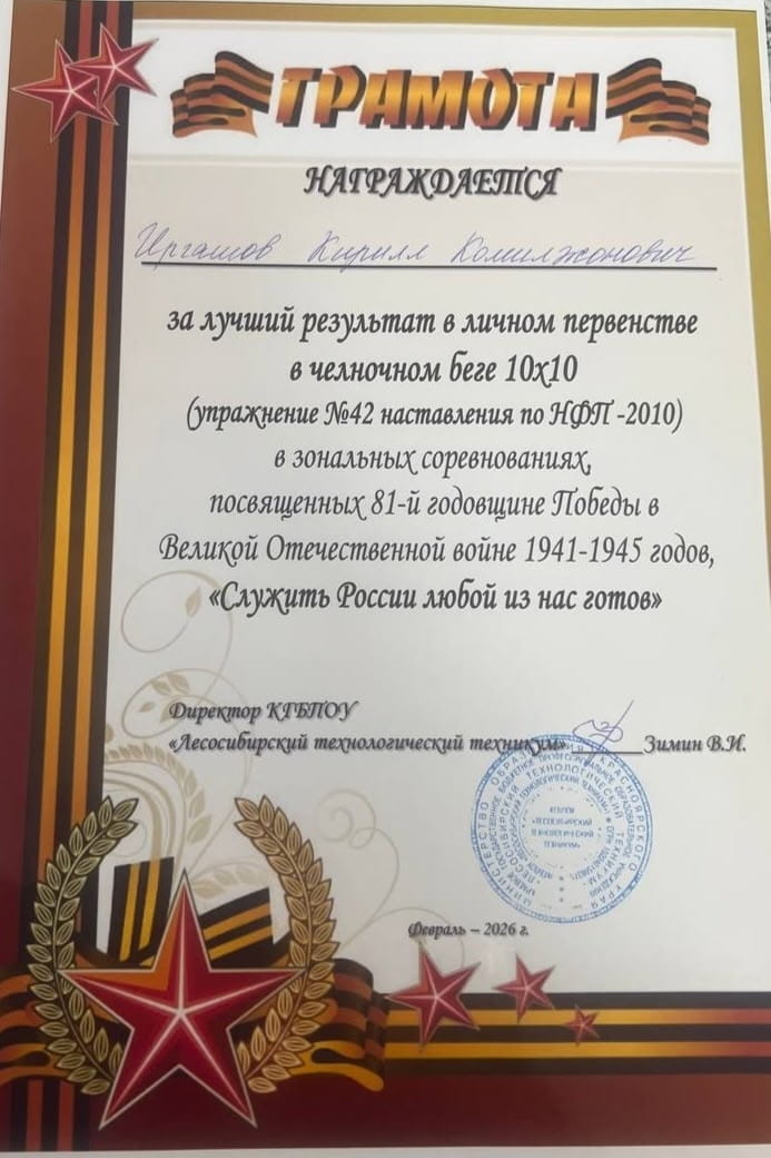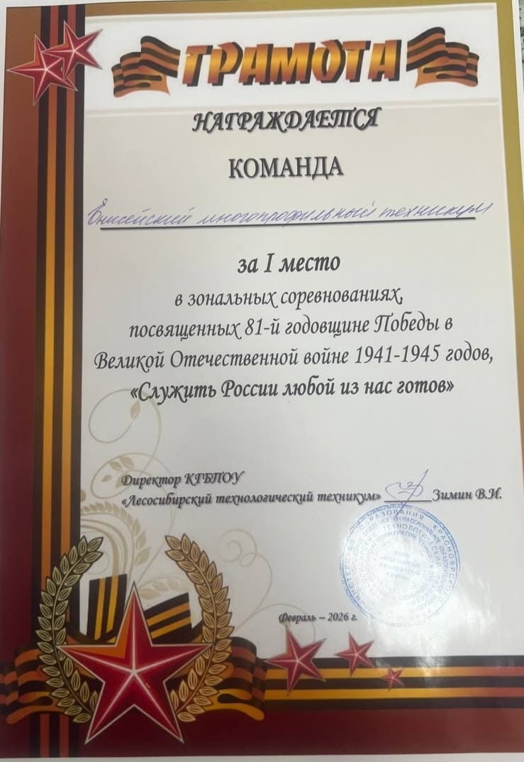 Февраля 2026 года в КГБ ПОУ «Лесосибирском технологическом техникуме» прошли зональные соревнования, посвященные 81-й годовщине Победы в Великой Отечественной войне 1941-1945 годов, «Служить России любой из нас готов»