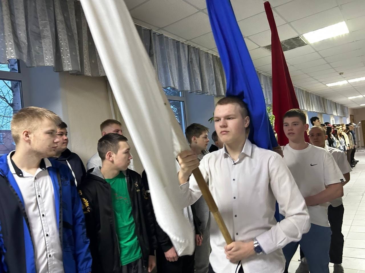 В ходе церемонии был внесён государственный флаг обучающимися группы 13 Св Вершининым Гермагеном, Назимовым Егором и Самойловым Антоном, все присутствующие исполнили гимн России.