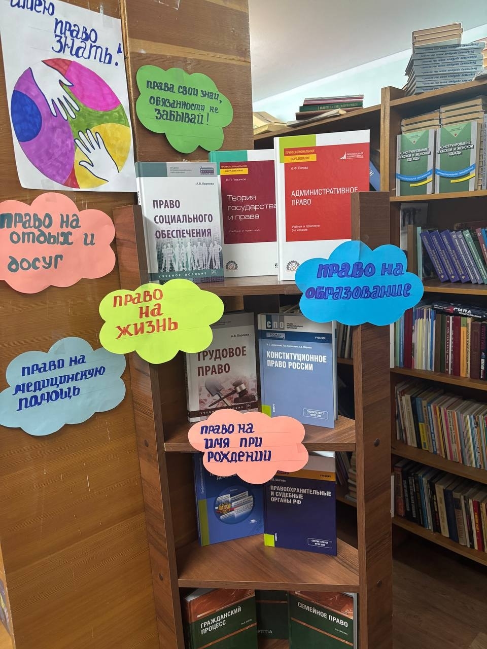В течение всего периода в библиотеке техникума работает тематическая книжная выставка «Имею право знать!», которая посвящена правам ребенка в современном обществе.