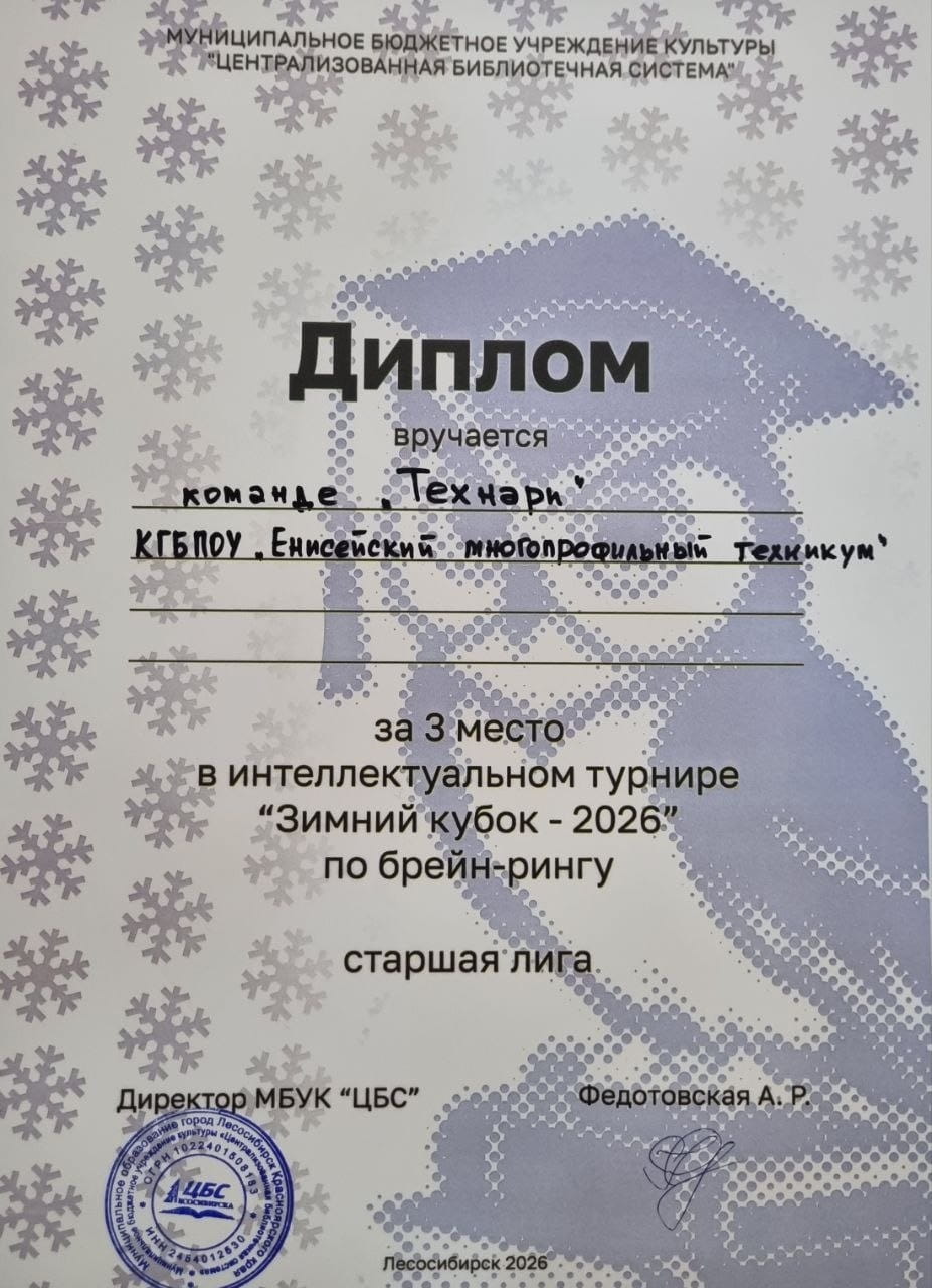🙇Интеллектуальный триумф: команда Енисейского многопрофильного техникума на Зимнем кубке по брейн-рингу!